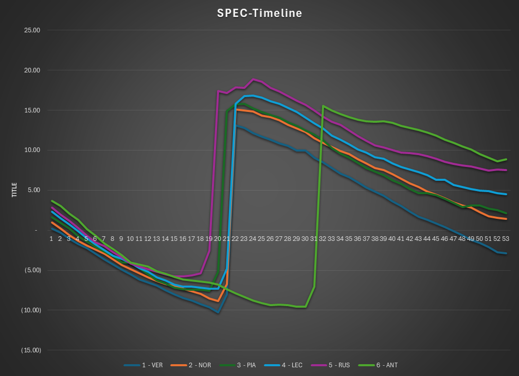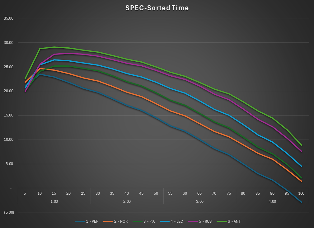 This is the SPEC view of the race. The lap times are normalized to isolate tire and fuel use. Car were normalized under a set of rules
