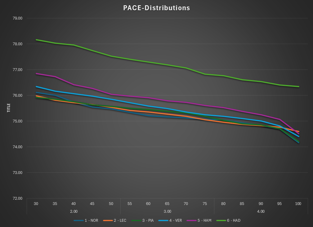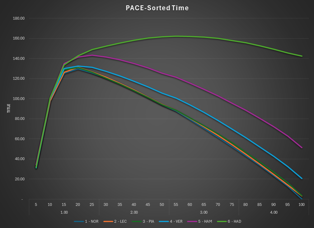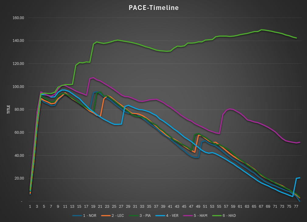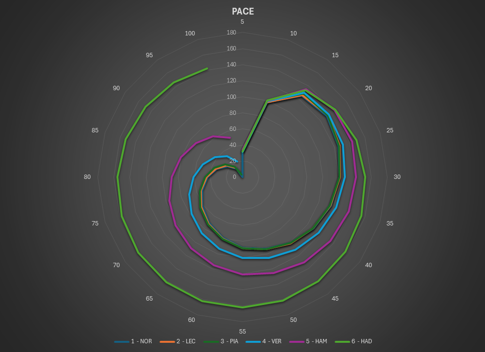 This is the Pace view of the race. The lap times are normalized to isolate tire and fuel use.