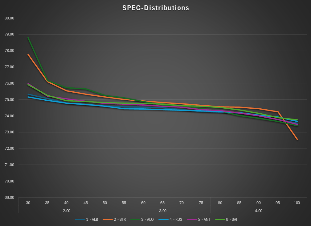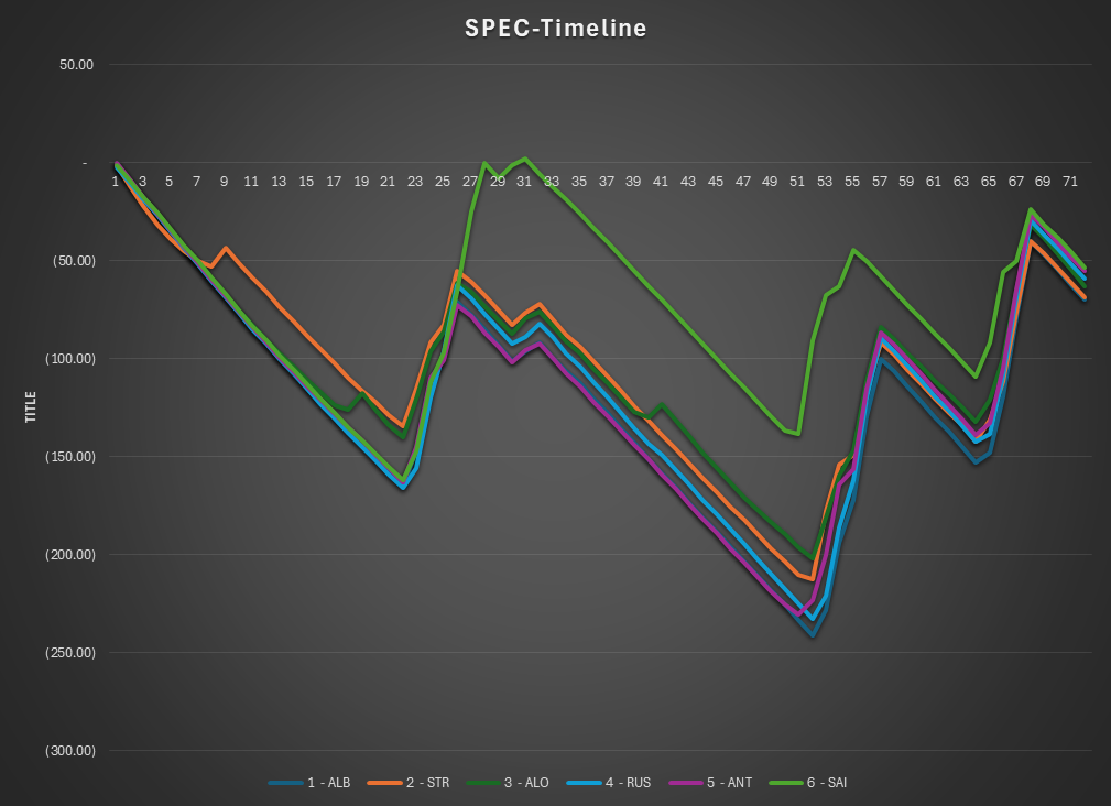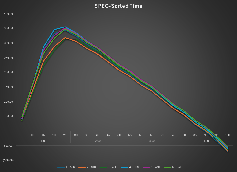 • This is the SPEC view of the race. The lap times are normalized to isolate tire and fuel use. Car were normalized under a set of rules