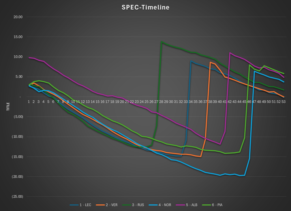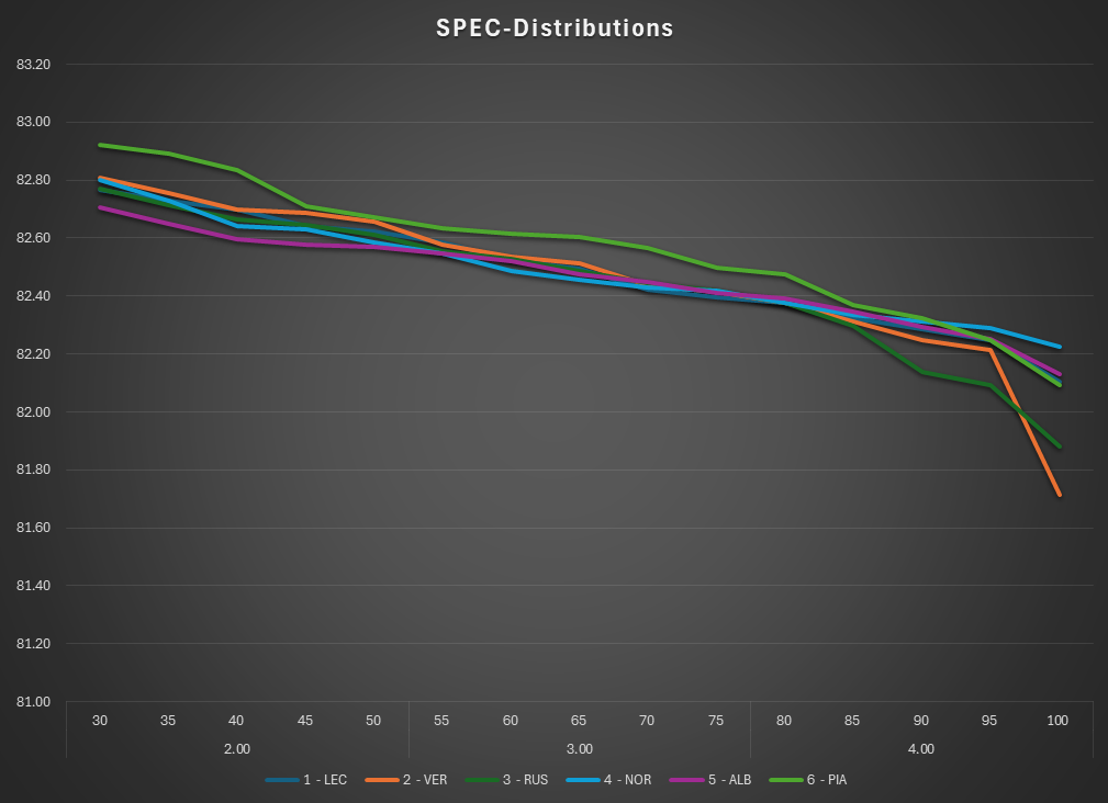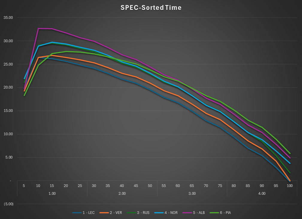 This is the SPEC view of the race. The lap times are normalized to isolate tire and fuel use. Car were normalized under a set of rules