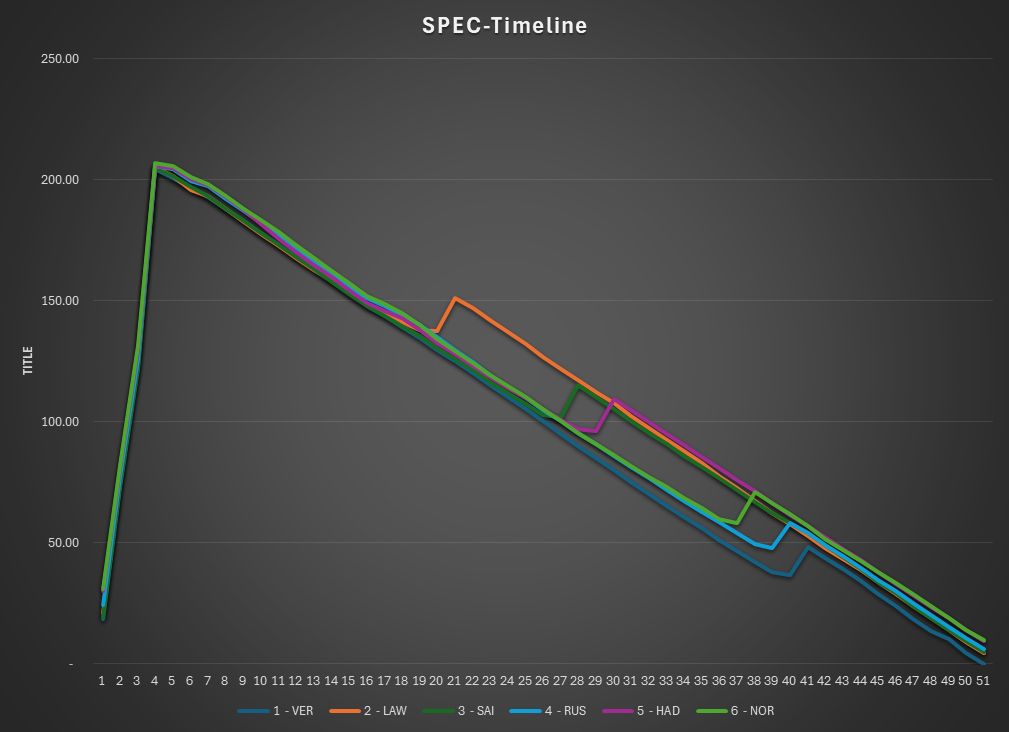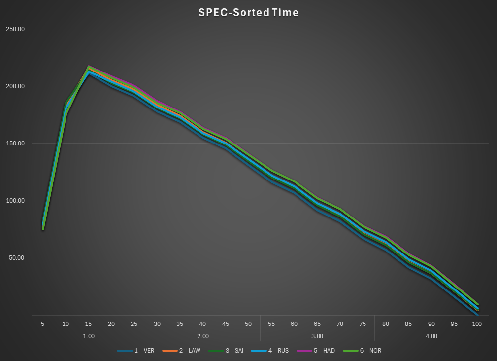 This is the SPEC view of the race. The lap times are normalized to isolate tire and fuel use. Car were normalized under a set of rules