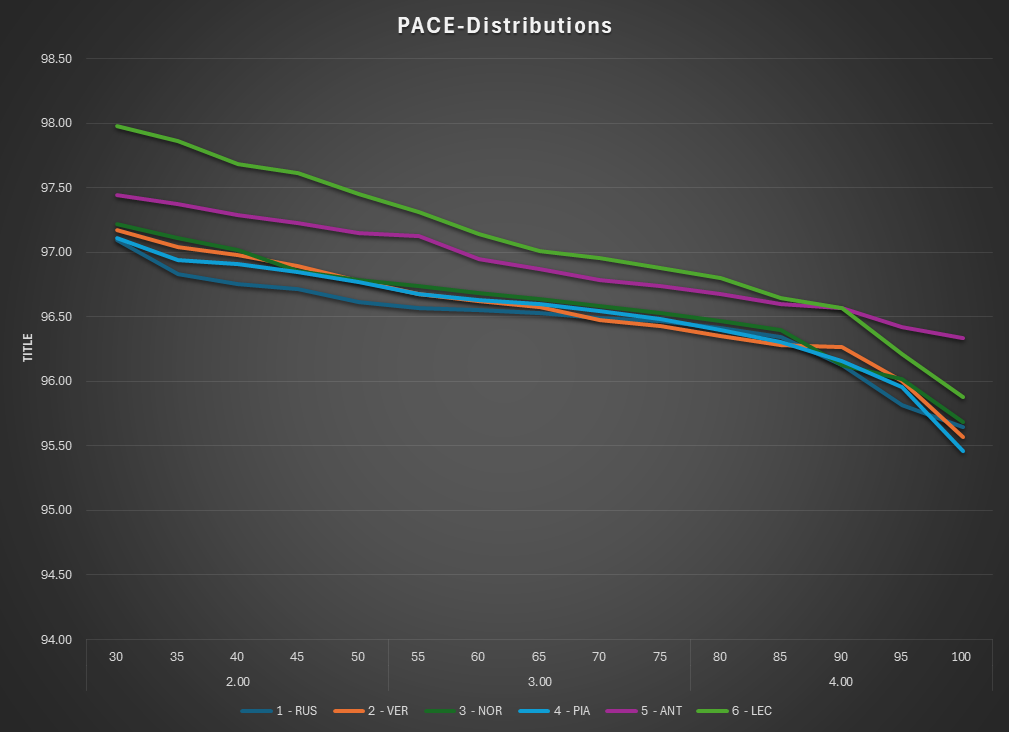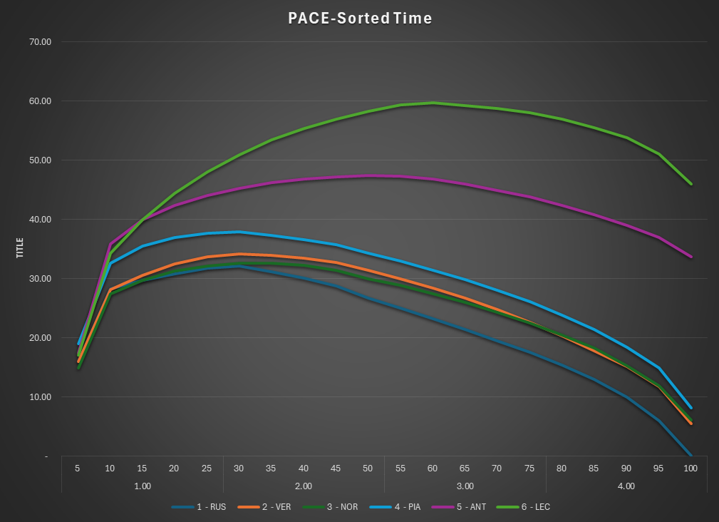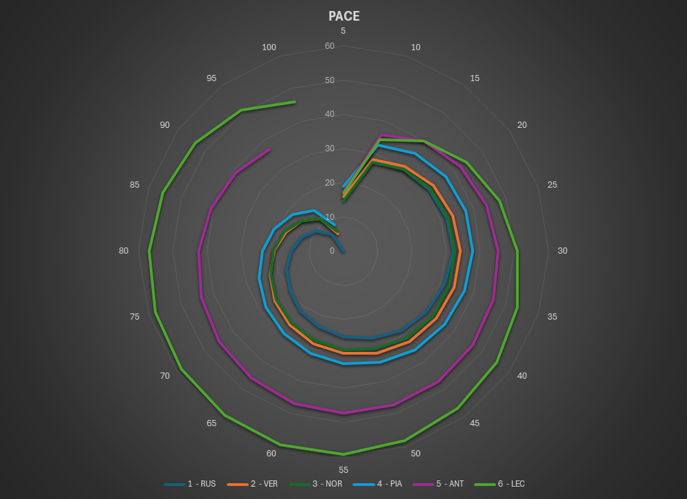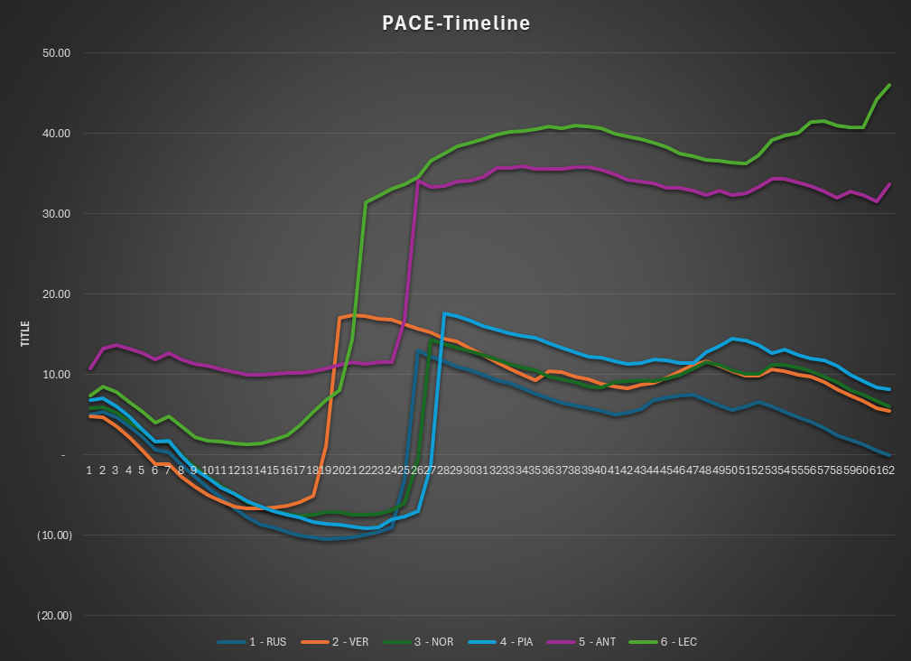 This is the Pace view of the race. The lap times are normalized to isolate tire and fuel use.