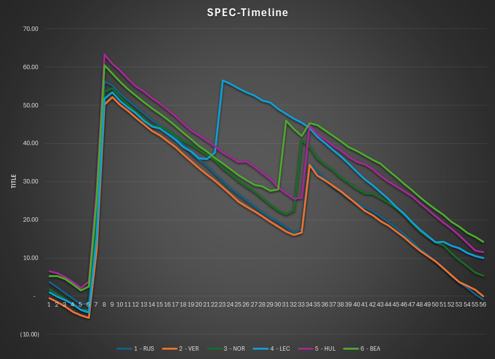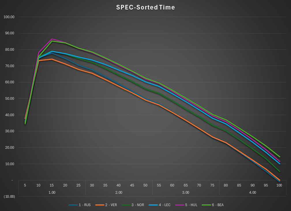 This is the SPEC view of the race. The lap times are normalized to isolate tire and fuel use. Car were normalized under a set of rules