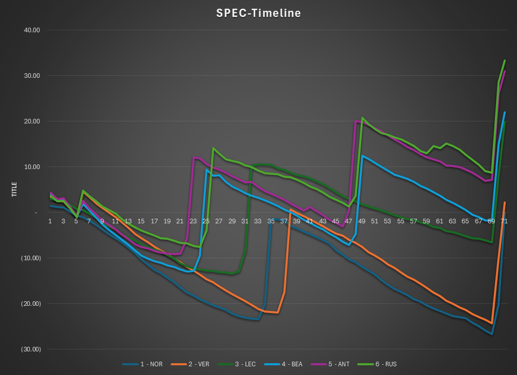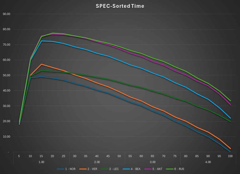 This is the SPEC view of the race. The lap times are normalized to isolate tire and fuel use. Car were normalized under a set of rules