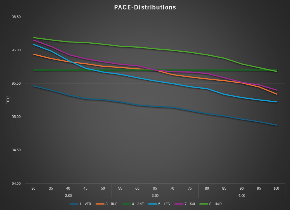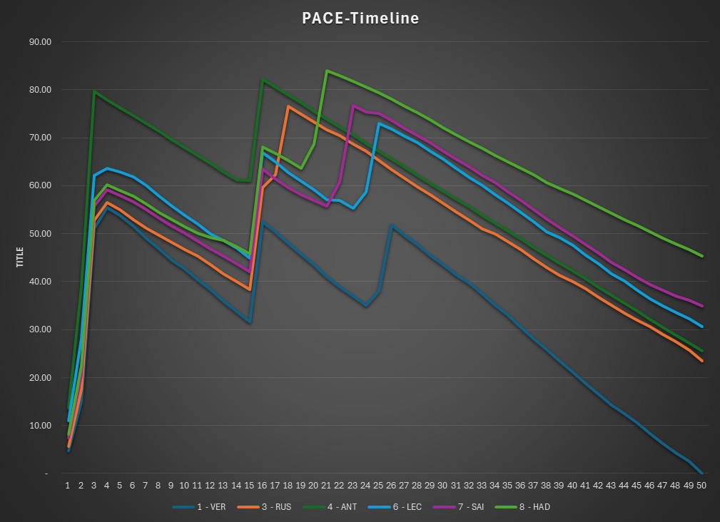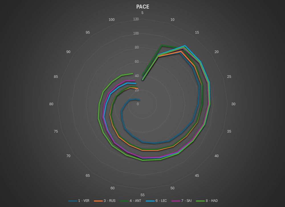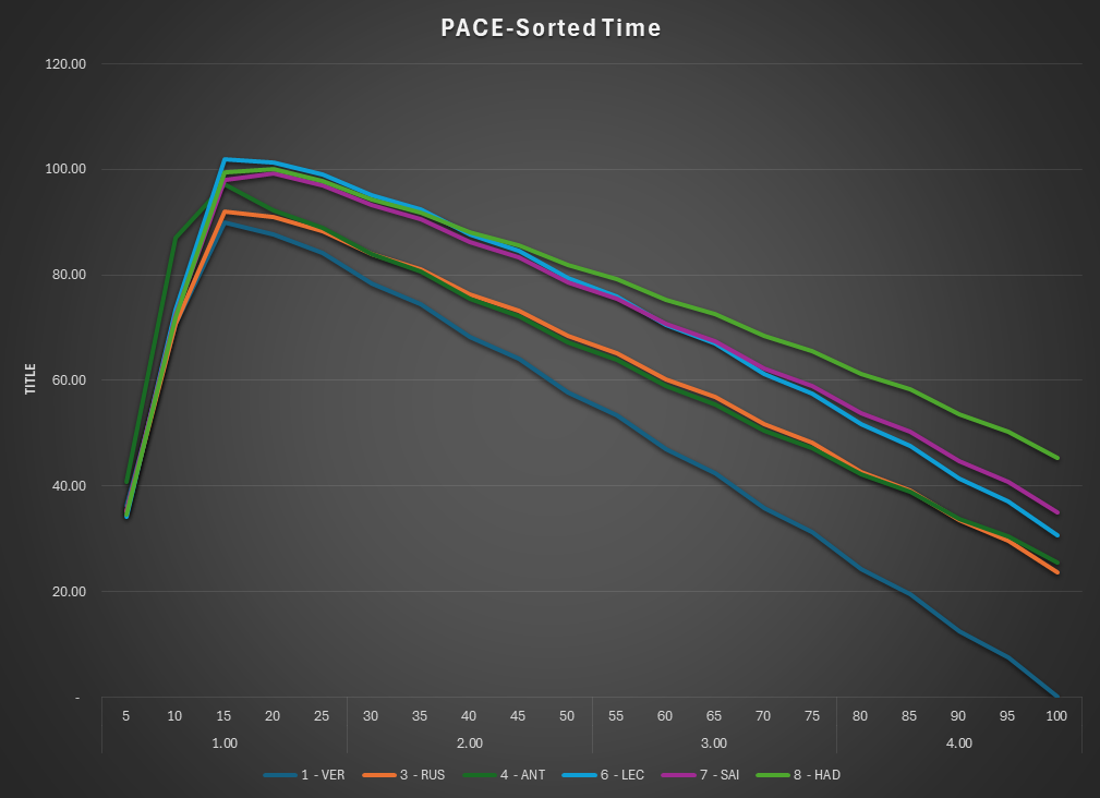 This is the Pace view of the race. The lap times are normalized to isolate tire and fuel use.