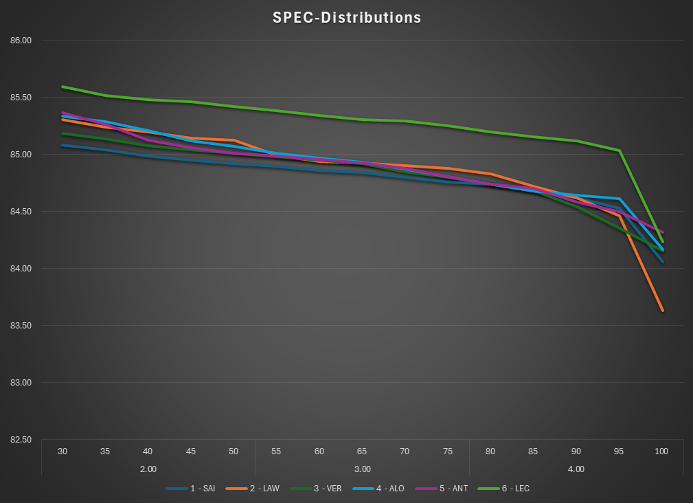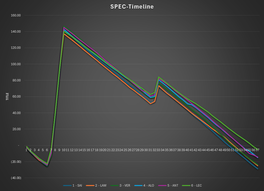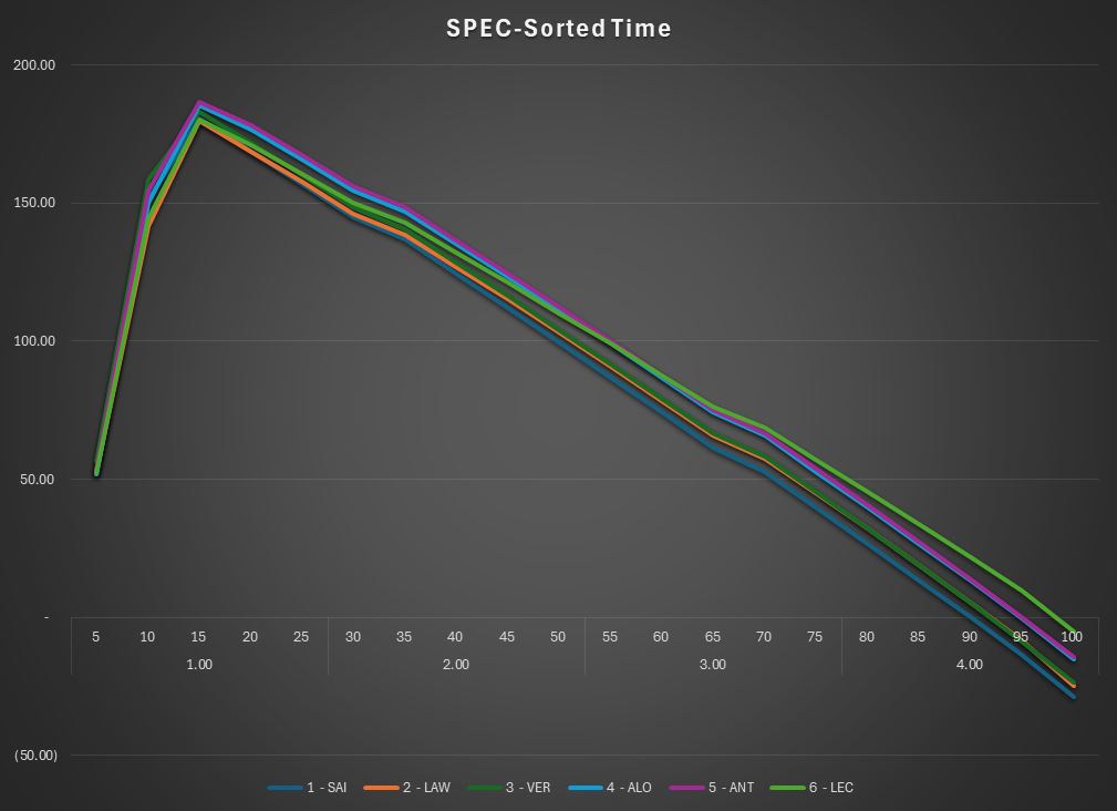 This is the SPEC view of the race. The lap times are normalized to isolate tire and fuel use. Car were normalized under a set of rules