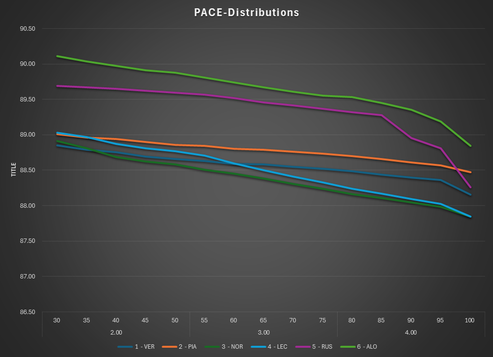 Q4: The hierarchy holds into the final quartile. NOR and LEC retain the strongest closing pace; VER remains consistent but lacks top-end pace. RUS and ALO remain outside the leading pace window.