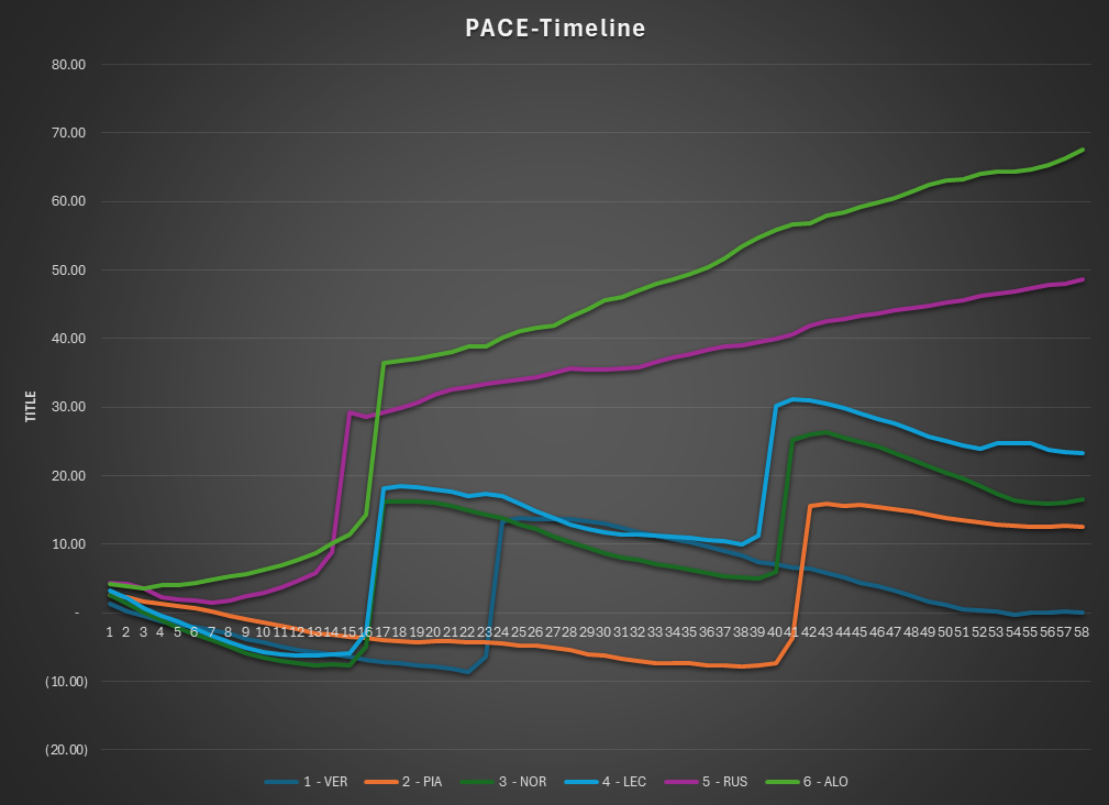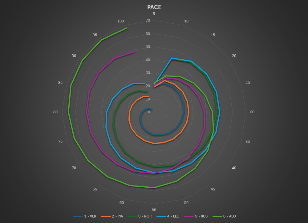 Q1: Clear advantage to one-stop strategy and track position. VER, PIA, RUS, and ALO occupy the leading pace band.
