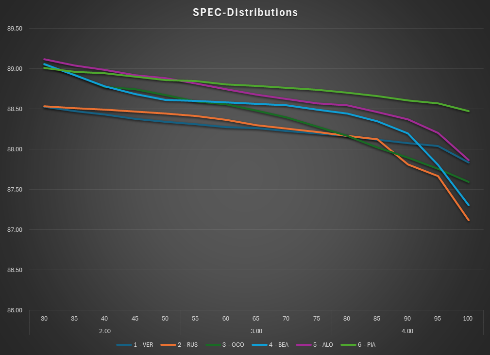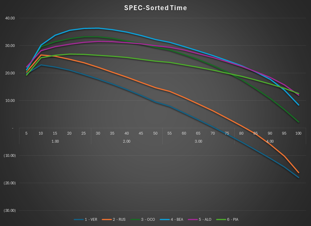 This is the Spec view of the race. The lap times are normalized to isolate tire and fuel use. The car performance has been leveled using a set of rules