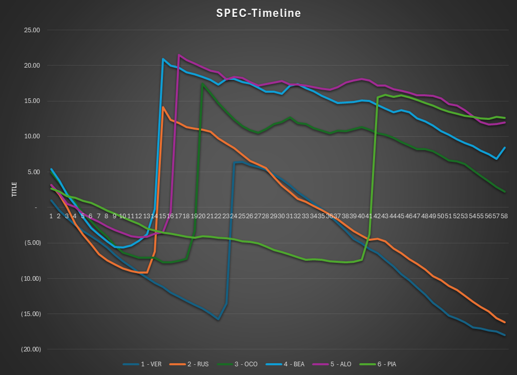 Q1: Clear advantage to one-stop strategy and track position. VER, PIA, RUS, and ALO occupy the leading pace band.
