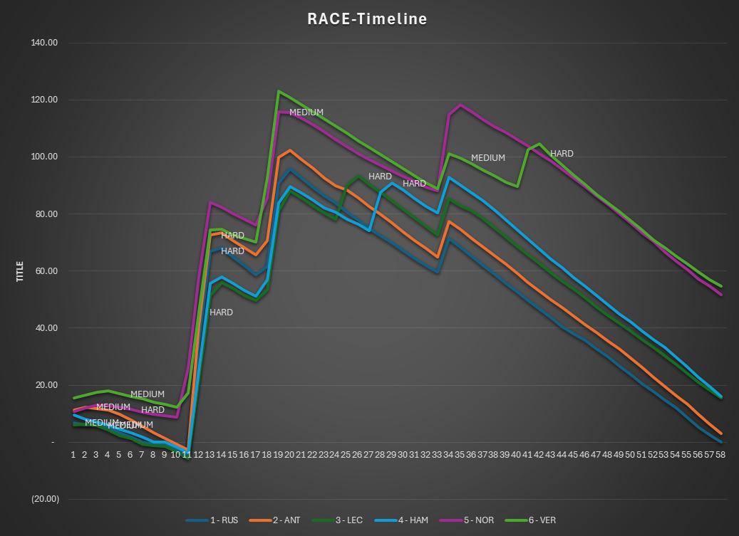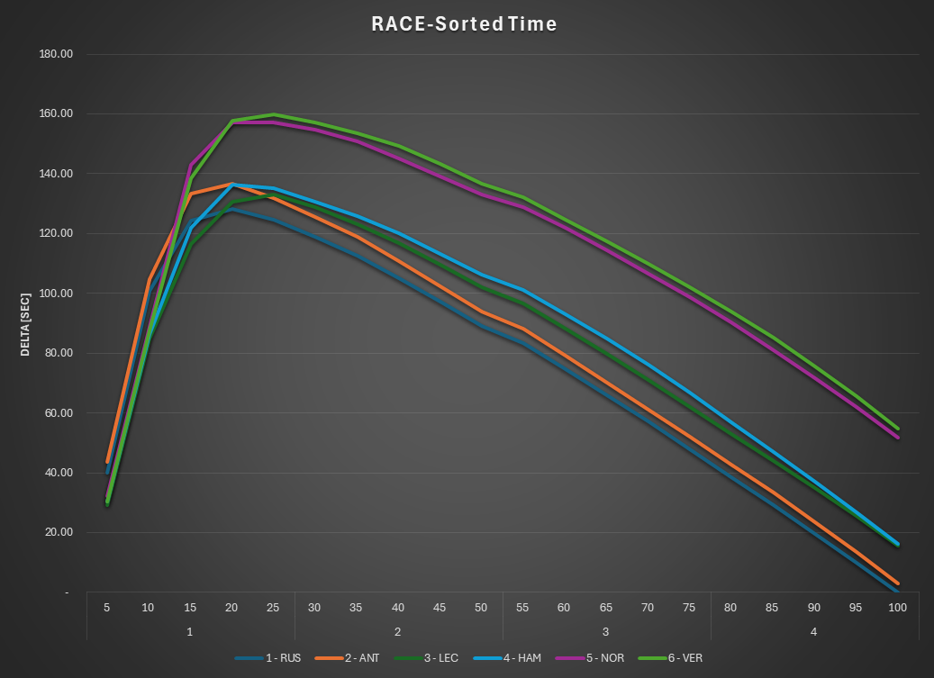 Russell, Antonelli, Leclerc and Hamilton all circulated within a narrow performance envelope. The distribution confirms that none of the leading drivers held a decisive pace advantage over the others. Instead, the final order was largely determined by strategy rather than outright speed.