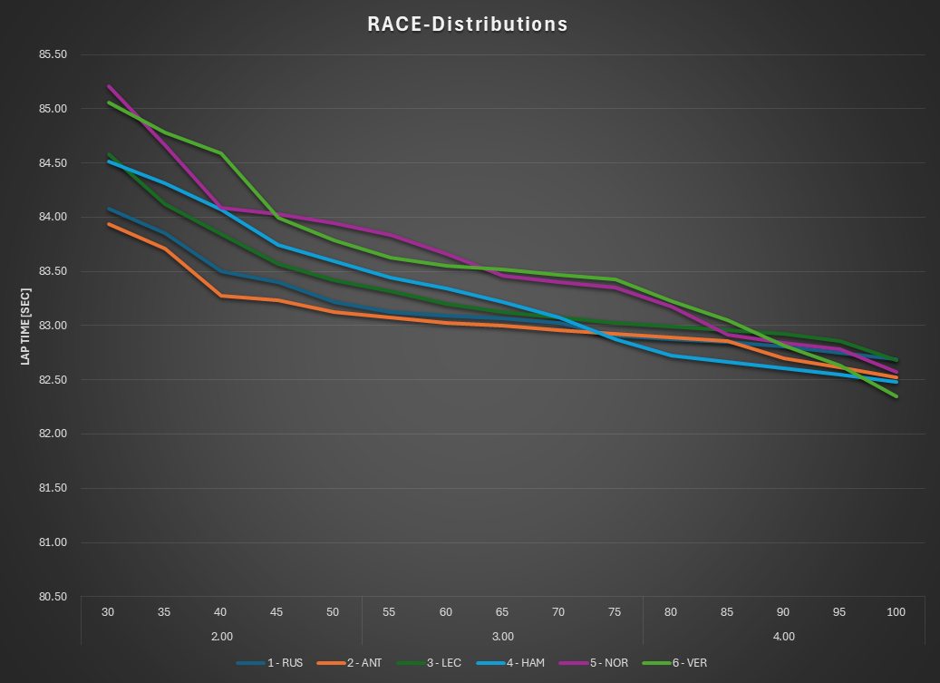 The distribution analysis confirms that George Russell managed the race rather than driving at the limit. His pace remained consistently competitive across the race distance, but the distribution suggests that he rarely needed to expose the full performance potential of the Mercedes. The race was effectively controlled from the front.