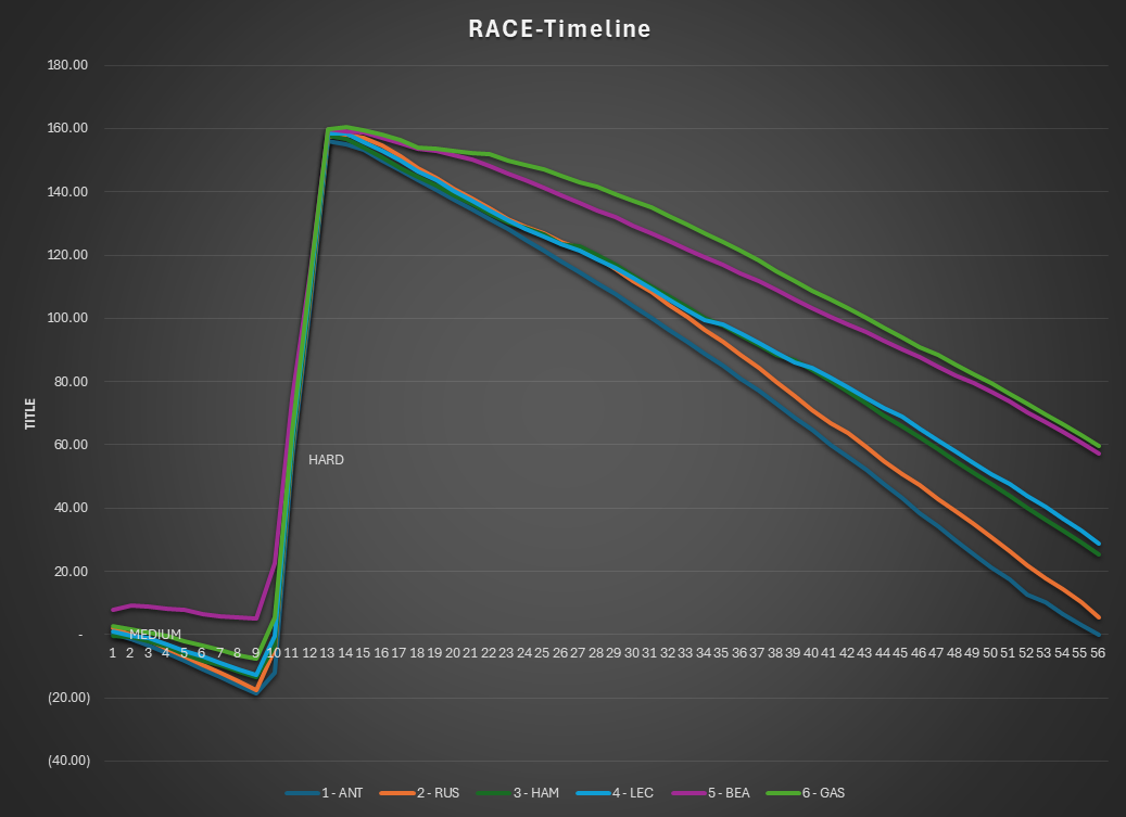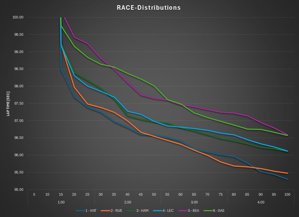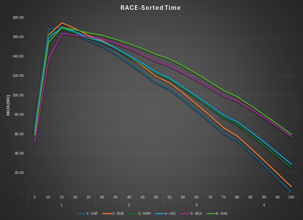 From the front, Antonelli managed the race rather than extending the gap, maintaining a stable performance envelope that Russell never fully threatened. The sorted curves show a controlled race from pole position, allowing the young Italian to convert his advantage into a first Grand Prix victory.