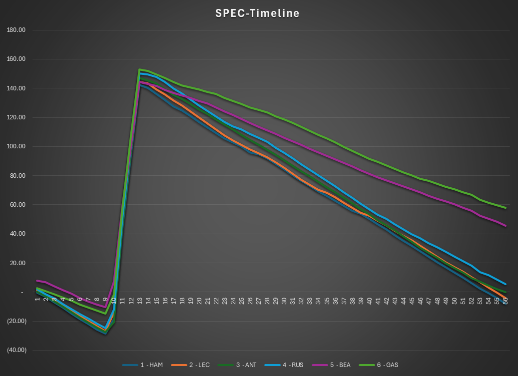 The distributions also reveal the context behind Russell’s performance. Several laps spent behind the Ferraris compressed his pace envelope early in the race before he could exploit the Mercedes potential in clean air.