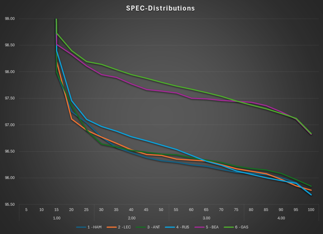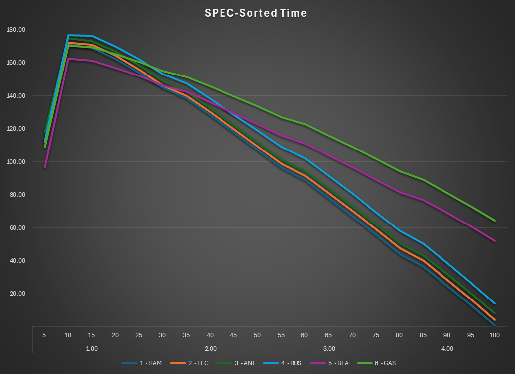 The SPEC Sorted chart integrates the normalized lap-time distributions in the same way the Race and Pace instruments do, but here every driver is projected onto a common performance platform. The resulting curves reconstruct the cumulative gap that would emerge if the entire field had competed with identical machinery, isolating the contribution of the driver.