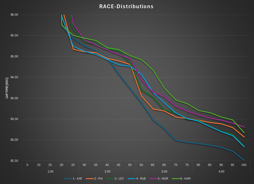 The leading group remains tightly packed. Kimi, George, Oscar, Charles,Lando and Lewis all operate within a narrow band, anyway a decisive separation emerges across the distribution. This is the inherent limitation of the RACE domain.