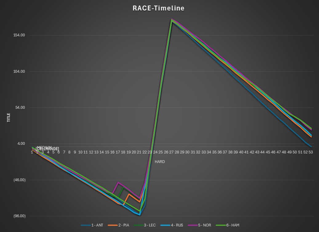 By combining raw lap times with traffic, strategy, and Safety Car effects, the chart preserves the structure of the race rather than isolating its underlying drivers.