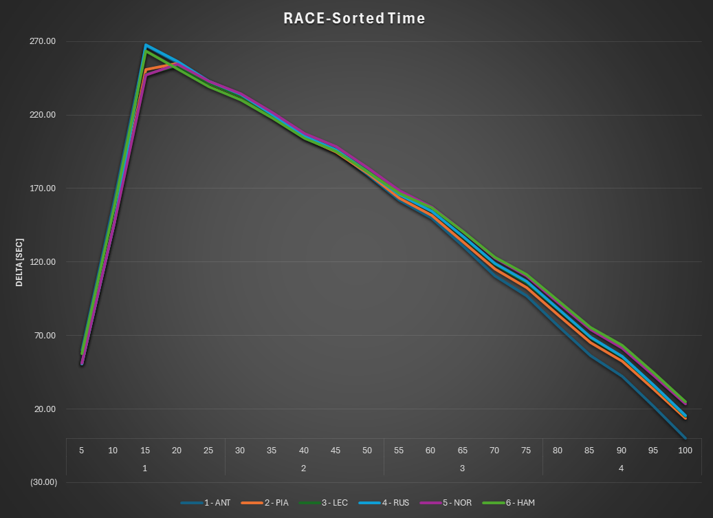 Oscar sits just behind, delivering a solid and composed drive. His distribution is clean, stable. But it never quite reaches the Mercedes layer. The gap is not dramatic, but it is consistent — visible across most of the spectrum. A strong race, executed well, just not at the same performance ceiling.