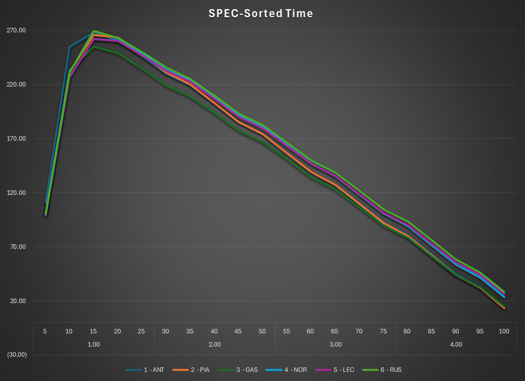 The SPEC Sorted view removes time and orders the normalized laps across the full distribution, allowing the fine structure of performance to emerge.