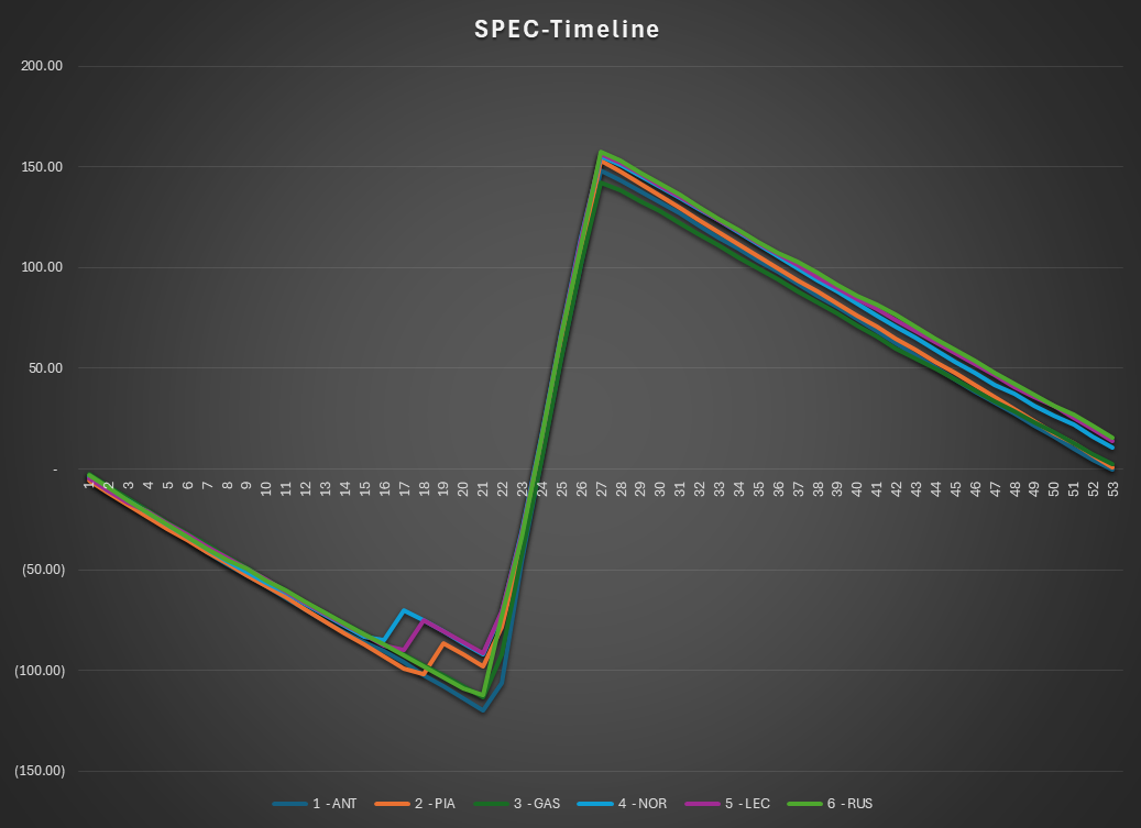 The SPEC view isolates car performance relative to the field — removing not just race conditions, but also compressing the package differences.